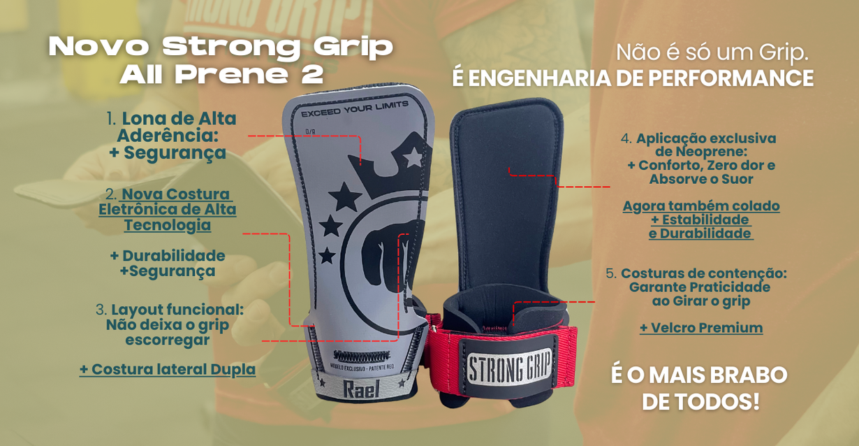 O Grip mais Brabo que você já conheceu! Não deixa a mão abrir nem doer de verdadade! Personalizado! Exclusivo e de Patente! Alta performance, conforto extremo, segurança real. Tecnologia All Prene exclusiva e patenteada. Não abre, não dói, não falha. Feito pra quem leva o treino a sério. Strong Grip — O grip mais estratégico do Brasil.